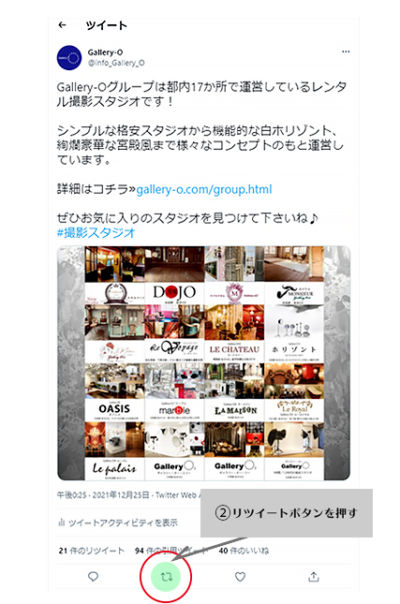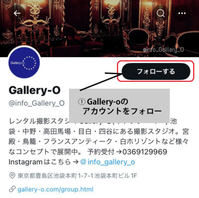 ①X(旧Twitter)にログインした状態で、「ギャラリーオーのアカウント」へ。リンクはこちら>>